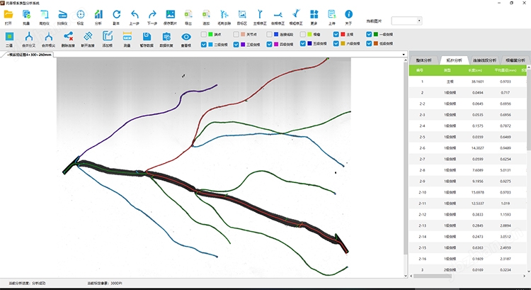 1、拓撲分析:根系分析系統能自動進行根系的拓撲分析,自動確定根的連接數、長度、體積等參數,可自動區分側根等級自動分析主根或任意一支側根的參數等,根系等級分為8級,使根系分析更加準確;