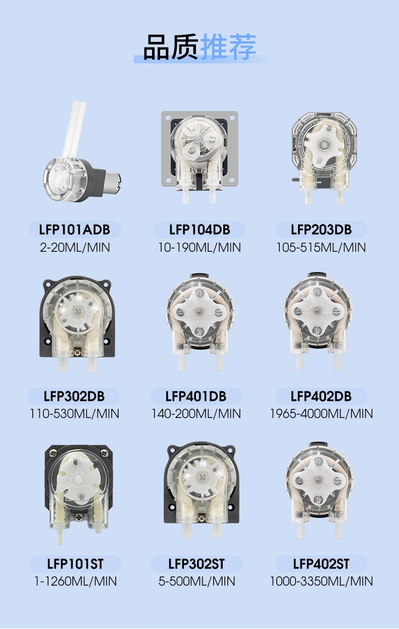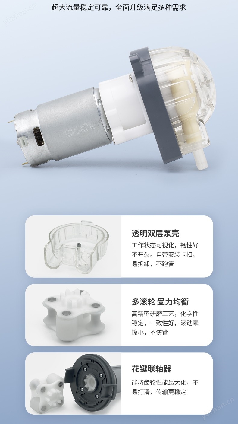 LFP303A/DB直流有刷蠕動泵是一款高性能流體輸送設備,采用高精度直流電機驅動,提供210-730ml/min的大流量精準控制。產品具有運行和超長使用壽命特性,采用人性化設計,可快速更換軟管。自帶安裝孔設計(可定制),工作電壓支持DC12V/24V,功率≤12W,重量300g,適應0~45℃工作環境。標配2滾輪(可選4滾輪)結構,適配BPT管、硅膠管、氟膠管等多種管材,是洗碗機/洗衣機、消毒設備、儀器儀表及化工工業等領域的專業級流體控制解決方案,特別適合大流量穩定輸送的應用場景。
