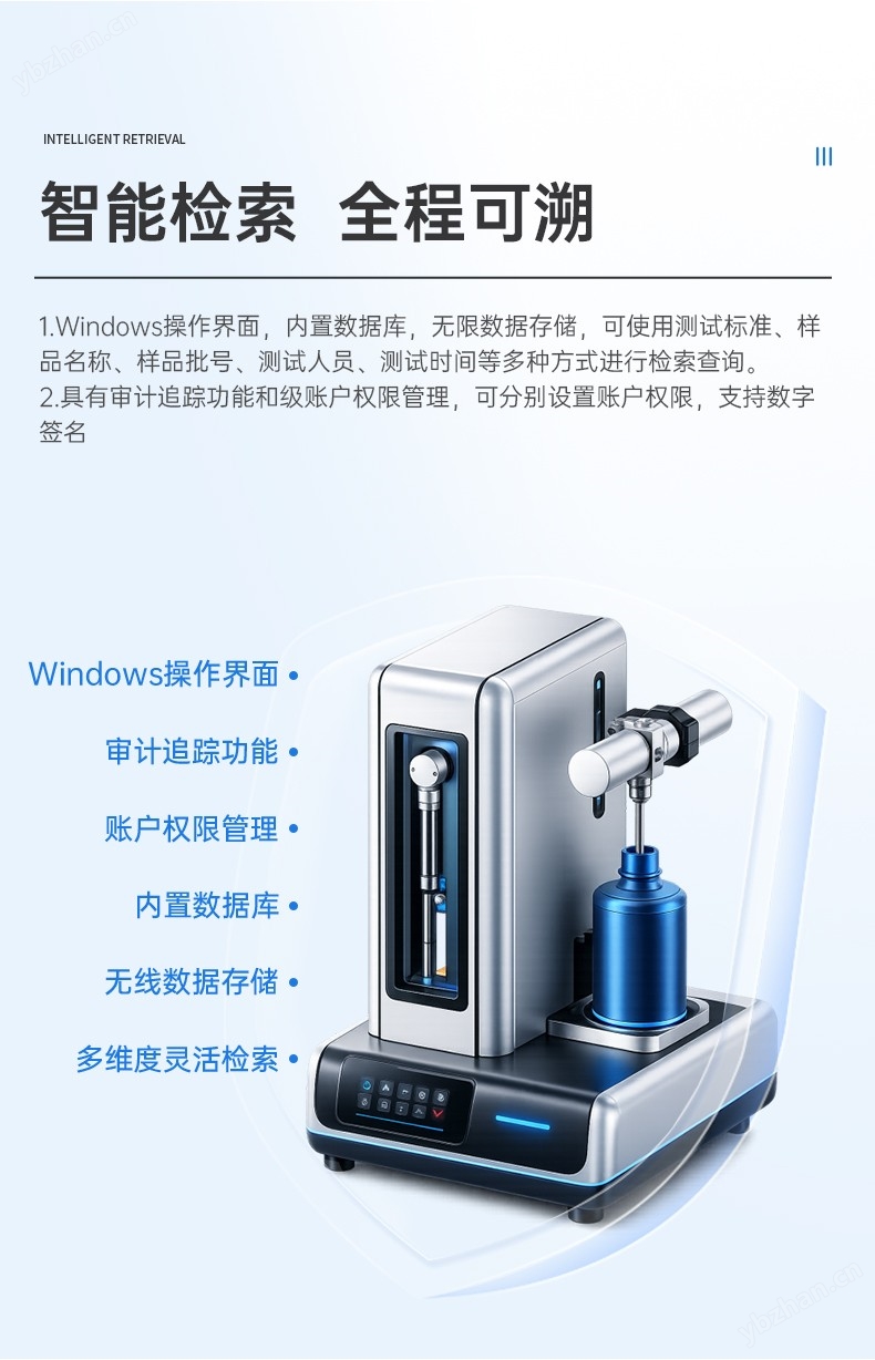 l Windows操作界面,內(nèi)置數(shù)據(jù)庫(kù),無(wú)限數(shù)據(jù)存儲(chǔ),可使用測(cè)試標(biāo)準(zhǔn)、樣品名稱、樣品批號(hào)、測(cè)試人員、測(cè)試時(shí)間等多種方式進(jìn)行檢索查詢