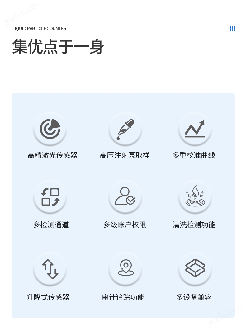 l 液體顆粒計(jì)數(shù)器內(nèi)置數(shù)據(jù)分析系統(tǒng),一次測(cè)試可以給出所有標(biāo)準(zhǔn)的測(cè)試數(shù)據(jù)和污染度等級(jí)