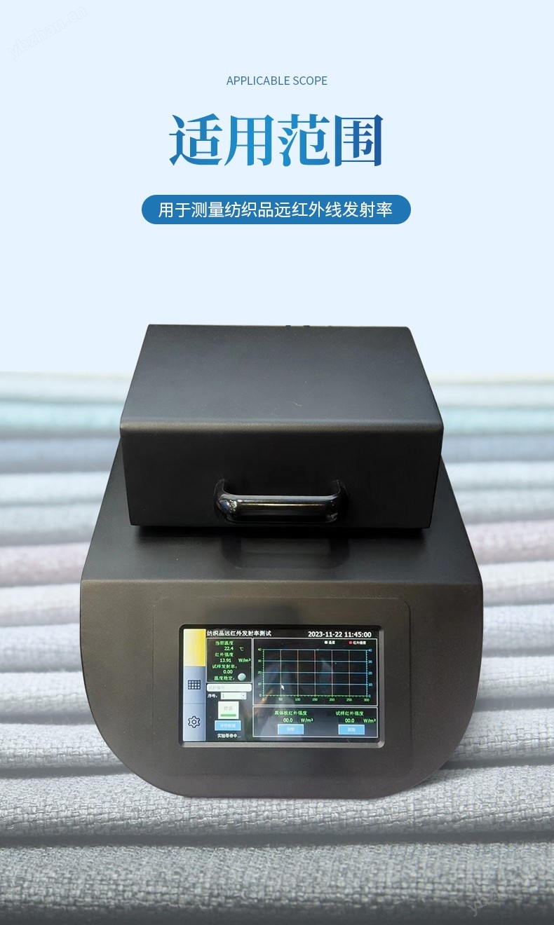 將標準黑體板與試樣先后置于熱板上,依次調節熱板表面溫度使之達到規定溫度;用光譜響應范圍覆蓋5微米~14微米波段的遠紅外輻射測量系統分別測定標準黑體板和試樣覆蓋在熱板上達到的穩定后的輻射強度,通過計算試樣與標準黑體板的輻射強度之比,從而求出試樣的遠紅外發射率。