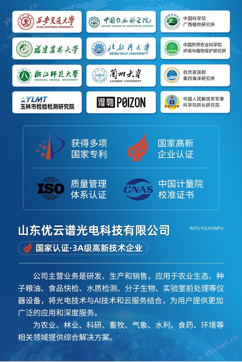 山東優云譜光電科技有限公司(品牌:優云譜)是一家集科工貿為一體的綜合型科學儀器智造企業,是高新技術企業、科技型中小企業。公司資質體系完備,涵蓋 ISO9001 質量管理體系、知識產權管理體系、職業健康安全管理體系、環境管理體系等多項認證,同時持有3A信用企業、商品售后服務認證、醫療器械經營許可證等資質。依托百余人的專業研發團隊與50項核心,公司在科學儀器領域技術實力突出,全國布局多個售后服務網點(全國聯保、24小時響應),為多行業多領域提供精準高效、高性價比的科學儀器檢測設備與解決方案,是行業內值得信賴的靠譜服務商。