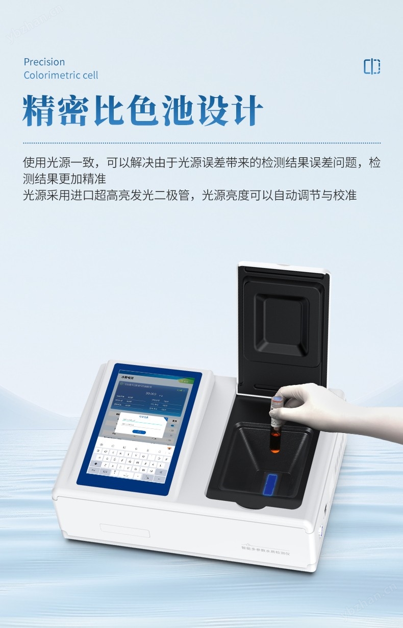 3.采用精密比色池設計,使用光源一致,可以解決由于光源誤差帶來的檢測結果誤差問題,檢測結果更加精準;