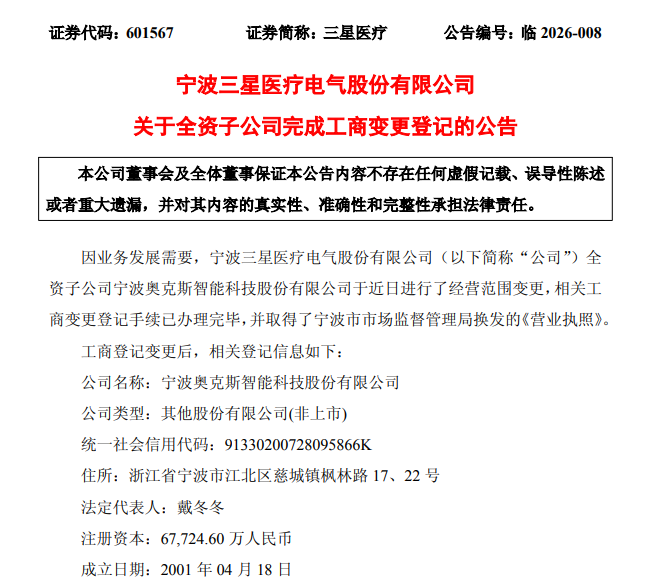儀表網 企業動態】3月12日,國內智能配用電與醫療服務雙主業龍頭企業三星醫療(601567)發布公告,宣布公司旗下全資子公司寧波奧克斯智能科技股份有限公司(下稱“奧克斯智能科技”)已順利完成經營范圍變更的工商登記備案手續,成功領取由寧波市市場監督管理局換發的新版《營業執照》。此次工商變更并非簡單的業務范圍調整,而是三星醫療依托原有電力裝備核心優勢,正式向新能源、儲能等綠色能源新興賽道戰略延伸的關鍵一步,標志著奧克斯智能科技全面開啟新能源相關業務的市場化布局。