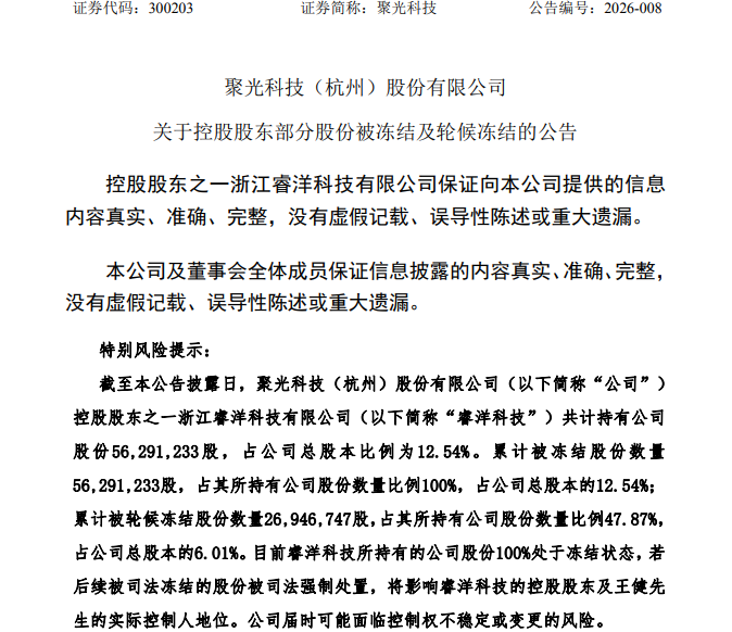 【儀表網 企業動態】4月1日,聚光科技(300203)發布公告披露,公司控股股東浙江睿洋科技有限公司所持全部股份已被司法凍結,公司控制權穩定性引發市場廣泛關注。