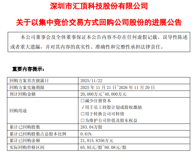 儀表網 企業動態】4月1日,匯頂科技(603160)發布回購進展公告,截至2026年3月31日,公司通過集中競價交易已累計回購股份283萬股,占總股本的0.61%,成交金額合計約2.18億元,回購價格區間為65.85元/股至80.08元/股。此次回購是公司2025年11月啟動的2億-4億元回購計劃的重要推進,核心用于員工持股計劃,彰顯對未來發展的信心與長期價值布局。