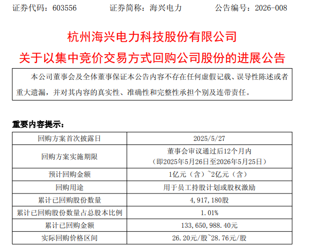 公告顯示,截至2026年3月31日,海興電力已累計通過集中競價交易方式回購公司股份491.72萬股,占公司當前總股本的比例為1.01%,累計支付的回購資金總額達1.3365億元。從回購價格來看,本次回購股份的價格區間穩定在26.20元/股至28.76元/股之間,整體價格波動平緩,體現出公司回購操作的穩健性和理性性。