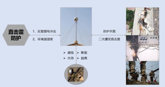 傳統雷電防護措施存在諸多難以克服的問題。在直擊雷防護方面,接閃器、引下線等設備長期暴露在戶外,經反復雷電沖擊和環境溫濕度的影響,易出現腐蝕、失效、斷裂、脫離等情況,進而導致防護失敗,使建筑物和設備面臨二次雷擊的風險。感應雷防護中,防雷器在反復雷電沖擊、環境溫濕度變化及電網電流電壓波動的作用下,會逐漸劣化、穿孔,甚至發生熱崩潰、炸裂,無法有效阻擋感應雷的侵襲。而接地裝置同樣受土壤電阻率、環境溫濕度及電壓電流的影響,易出現腐蝕、失效等問題,導致接地電阻升高,引發地電位反擊。此外,傳統防雷設備老化失效、開路難以及時發現,設備信息孤立,運維依賴定期現場巡檢,不僅工作量大、成本高,還存在人身安全風險,且缺乏提前預警功能,難以實現主動防護。